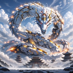 <lora:mecha_loong_v2:0.6>,a mecha dragon,8k,High quality,high quality,morning sunshine,glowing body,mechanical joint,orange led light,high detailed mecha,high-precision mecha,mecha,exoskeleton mechanical armor,red eyes,outdoors,horns,sky,growing joint,day,cloud,blue sky,no humans,glowing,cloudy sky,scenery,eastern dragon,pagoda,building,flying,jet device,high detailed,white mecha,HD,black joint,