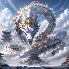 <lora:mecha_loong_v2:0.6>,a mecha dragon,8k, High quality, high quality, morning sunshine, glowing body, mechanical joint, orange led light, high detailed mecha, high-precision mecha, mecha, exoskeleton mechanical armor, mecha dragon, a dragon is flying through the air with clouds in the background and a building in the foreground with a sky background, red eyes, outdoors, horns, sky, growing joint, day, cloud, blue sky, no humans, glowing, cloudy sky, scenery, dragon, architecture, east asian architecture, eastern dragon, pagoda, building, flying, jet device, high detailed, white mecha, HD, black joint