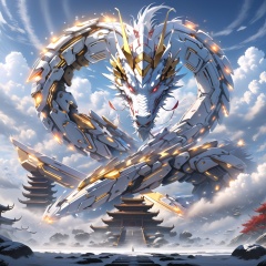 <lora:mecha_loong_v2:0.6>,a mecha dragon,8k,High quality,high quality,morning sunshine,glowing body,mechanical joint,orange led light,high detailed mecha,high-precision mecha,mecha,exoskeleton mechanical armor,red eyes,outdoors,horns,sky,growing joint,day,cloud,blue sky,no humans,glowing,cloudy sky,scenery,eastern dragon,pagoda,building,flying,jet device,high detailed,white mecha,HD,black joint,