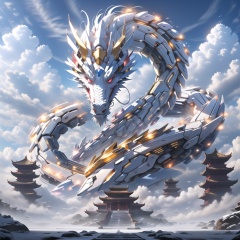 <lora:mecha_loong_v2:0.6>,a mecha dragon,8k, High quality, high quality, morning sunshine, glowing body, mechanical joint, orange led light, high detailed mecha, high-precision mecha, mecha, exoskeleton mechanical armor, mecha dragon, a dragon is flying through the air with clouds in the background and a building in the foreground with a sky background, red eyes, outdoors, horns, sky, growing joint, day, cloud, blue sky, no humans, glowing, cloudy sky, scenery, dragon, architecture, east asian architecture, eastern dragon, pagoda, building, flying, jet device, high detailed, white mecha, HD, black joint