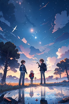 short_hair, multiple_girls, skirt, black_hair, 1boy, 2girls, standing, jacket, outdoors, sky, cloud, bag, from_behind, tree, night, bird, backpack, cloudy_sky, grass, star_(sky), scenery, starry_sky, reflection, sunset, shooting_star