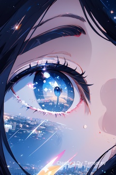 1girl, solo, bangs, blue_eyes, black_hair, sky, cloud, tears, eyelashes, night, crying, star_(sky), night_sky, scenery, close-up, starry_sky, reflection, crying_with_eyes_open, city, city_lights, eye_focus