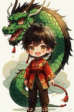 1boy, black pants, brown hair, chibi, chinese clothes, dragon, full body, green eyes, long sleeves, looking at viewer, male focus, open mouth, pants, petals, smile, solo, standing, tail