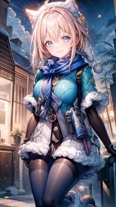 (extremely detailed CG), (best quality), 1girl, perfect face,shiny skin,narrow waist, wide hips  LynxLandau,elbow gloves,hair between eyes,white headwear, blue pantyhose,hood,bag,boots,capalet,short hair,fur trim, hat,blue scarf,ahoge,bangs, scarf ,blonde hair, blue eyes, gloves, snowi background, snow, steam, , panoramic view, smile ,snowing