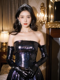 1girl,qianjin,(8k, RAW photo, best quality, masterpiece:1.3),(realistic,photo-realistic:1.37),(looking at viewer:1.331),soft light,extremely beautiful face,Random hairstyle,Random expression,big eyes,an extremely delicate and beautiful girl,depth of field,blurry background,blurry foreground,delicate,beautiful,beautiful face,beautiful eyes,beautiful girl,delicate face,delicate girl,8k wallpaper,(best quality:1.12),(detailed:1.12),(intricate:1.12),(ultra-detailed:1.12),(highres:1.12),hyper detailed,ultra-detailed,high resolution illustration,colorful,8k wallpaper,highres,Cinematic light,ray tracing,(8k, RAW photo, best quality, masterpiece, ultra highres, ultra detailed:1.2),(realistic, photo-realistic:),formal_dress,red dress,jewelry,earrings,necklace,dress,long hair,breasts,cleavage,blurry,bare shoulders,parted lips,black dress,red lips,black hair,pearl necklace,looking at viewer,blurry background,strapless dress,strapless,lips,tiara,medium breasts,upper body,lipstick,indoors,makeup,gloves,realistic,gem,
