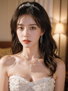1girl,qianjin,(8k, RAW photo, best quality, masterpiece:1.3),(realistic,photo-realistic:1.37),(looking at viewer:1.331),soft light,extremely beautiful face,Random hairstyle,Random expression,big eyes,an extremely delicate and beautiful girl,depth of field,blurry background,blurry foreground,delicate,beautiful,beautiful face,beautiful eyes,beautiful girl,delicate face,delicate girl,8k wallpaper,(best quality:1.12),(detailed:1.12),(intricate:1.12),(ultra-detailed:1.12),(highres:1.12),hyper detailed,ultra-detailed,high resolution illustration,colorful,8k wallpaper,highres,Cinematic light,ray tracing,(8k, RAW photo, best quality, masterpiece, ultra highres, ultra detailed:1.2),(realistic, photo-realistic:),formal_dress,red dress,jewelry,earrings,necklace,dress,long hair,breasts,cleavage,blurry,bare shoulders,parted lips,black dress,red lips,black hair,pearl necklace,looking at viewer,blurry background,strapless dress,strapless,lips,tiara,medium breasts,upper body,lipstick,indoors,makeup,realistic,gem,