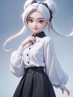 HTTP,fashion clothing, 1girl, solo, jewelry, white hair, skirt, earrings, bow, looking at viewer, shirt, hair bow, ribbon, black skirt, hair bun, gradient background, hand up, frills