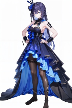 8k, best quality, masterpiece, (ultra-detailed:1.1), (high detailed skin), (full body:1.2), white background, standing, hand on hip, looking at viewer, <lora:yongye-v100-000027:0.8:lbw=OUTALL>, yongye, 1girl, dress, pantyhose, blue eyes, long hair, <lora:EnvyBetterHands LoCon_beta2 辅助:0.65>, (good hands,nice hands:0.6), (white background, simple background,:1.2), (beautiful_face), ((intricate_detail)), clear face, ((finely_detailed)), fine_fabric_emphasis, ((glossy)), full_shot