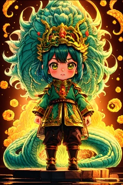 1girl, blush, chibi, closed mouth, dragon, dragon tail, earrings, eastern dragon, full body, green eyes, horns, jewelry, long hair, long sleeves, looking at viewer, scales, solo, tail, very long hair, white background