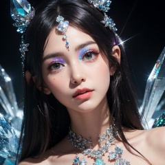 masterpiece, best quality, masterpiece,best quality,official art,extremely detailed CG unity 16k wallpaper,masterpiece, ((1girl)),(science fiction:1.1), (ultra-detailed crystallization:1.5), (crystallizing girl:1.5), kaleidoscope, ((iridescent:1.5) long hair), (glittering silver eyes), sitting, surrounded by colorful crystals, blue skin, (skin fusion with crystal:1.8), looking up, face focus, simple dress, transparent crystals, flat dark background, lens flare, prism,
