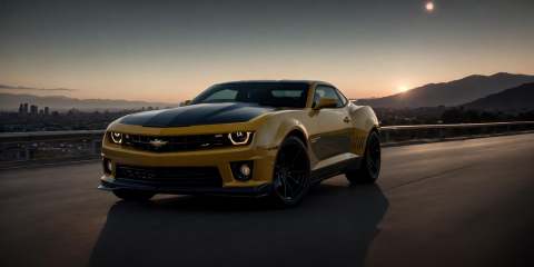 Camaro - Bumblebee,Camaro,masterpiece, highly detailed photorealistic 8k raw photo,dark night,bright tones,real light and shadow,best cinematic quality, volumetric lighting and shadows, the front of the car has a Camaro logo,1girl driving car, sprktt,cutting-edge design, showcasing sleek lines, advanced features, innovation, futuristic cityscape, high-tech laboratory, futuristic cityscape background, Full shot, shiny and reflective bodywork ,8k <lora:Camaro - Bumblebee:0.7>