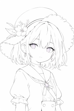 Straw hat,quality_best, style_onineko, (Distinct pupils)(Clear eyes), 1girl, solo, c, earrings, looking at viewer, flower, short hair, bangs, closed mouth, simple background, black headwear, white background, red flower, upper body, white hair, hair intakes, frills, purple eyes, hair ornament, expressionless, hat flower, eyelashes, best quality