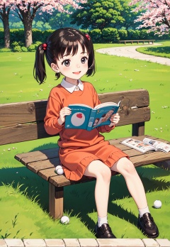 ((A child,small cute plush ball errings,pigtails,jumper skirt,A charming smile,reading picture-story book)),Parks, lawns, cherry trees, benches,masterpiece, best quality,