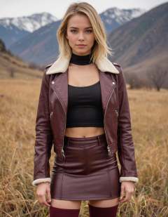(Very close shot, zoomed in close-up face portrait:1.5) photo of a smiling, (closed mouth:1.5) flirty beautiful weightlifter young 18 year old Hawaiian woman with short straight bohemian blonde hair,. (small breasts:1.3), toned ass.She is wearing a (maroon leather jacket, skirt, and tights, high heel boots:1.1).She is slutty leaning facing away from camera, in a field with canyons and small mushrooms in the background. morning, snowing.cinematic lighting, vibrant colors, detailed skin texture, detailed cloth texture, beautiful detailed perfect face, intricate sharp details, ultra high res