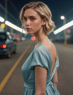 (Very close shot, zoomed in close-up face portrait:1.5) photo of a thinking, (closed mouth:1.5) shy ******* fit young 18 year old Burkina Faso woman with medium wavy pixie cut blonde hair,. (small breasts:1.3), toned ass.She is wearing a (light blue silk long flowing dress, high heel sandals:1.1).She is erotically walking facing left, in a industrial district with industrial pipes and terminals in the background. night, foggy.cinematic lighting, vibrant colors, detailed skin texture, detailed cloth texture, beautiful detailed perfect face, intricate sharp details, ultra high res