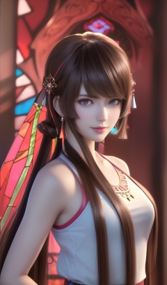 (,1girl, ,best quality, ),looking at viewer, <lora:386-DA-永生-红怡:0.8> ,,ultra detailed background,ultra detailed background,ultra realistic 8k cg,,, (close-up portrait),(upper body:1.22),(realistic:1.11),(Photo-referencing),HDR,Studio Lighting,Soft Lighting, ,, a slender petite little girl,Delicate muscle lines,(Skinny body),(solo:1.5),( looking at viewer:1.22),The white shiny skin, (smirk:1.2),(dynamic pose),(arms behind back),arms at sides, (very long payot),(Absurdly long Brown straight hair:1.22),parted bangs, (floating hair), (jewelry:1.17), necklace, earrings,(colorful:1.27),(stained glass background),(),(()),,