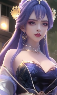 (,1girl, ,best quality, ),looking at viewer, <lora:388-DA-百炼成神-天穹-云洛-黑化:0.8> ,ultra detailed background,ultra detailed background,ultra realistic 8k cg,, ,masterpiece, (( , )),, ,tamari \(flawless\),     ,  orange blossoms,  (()), (), ,, 1girl, purple_hair, solo, breasts, earrings, jewelry, hair_ornament, long_hair, , cleavage,  large breasts, lips, looking_at_viewer, makeup,full body,