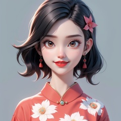 1girl,black hair,brown eyes,chinese clothes,earrings,floral print,grey background,hair ornament,jewelry,lips,lipstick,looking at viewer,makeup,red lips,simple background,smile,solo,upper body,