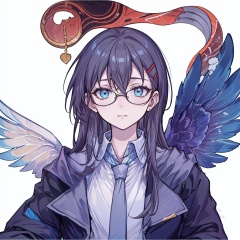 (masterpiece:1.3),(the best quality:1.2),(super fine illustrations:1.2),(Masterpiece),high quality,high detail,(white background:1.2),looking at viewer,(SOLO:1.4),outline,simplebackground,, feathered wings,wings,angel wings,bangs,thighhighs,high heels,boots,bird tail,bird wings,choker,white shirt,skirt,belt buckle,necktie,holding eyewear,open jacket,thigh holster,thigh strap,hair between eyes,jacket,blue eyes,belt,long hair,hairclip,