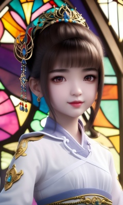 (,1girl, ,best quality, ),looking at viewer, <lora:389-DA-永生-虚月儿:0.8> ,,ultra detailed background,ultra detailed background,ultra realistic 8k cg,,, (close-up portrait),(upper body:1.22),(realistic:1.11),(Photo-referencing),HDR,Studio Lighting,Soft Lighting, ,, a slender petite little girl,Delicate muscle lines,(Skinny body),(solo:1.5),( looking at viewer:1.22),The white shiny skin, (smirk:1.2),(dynamic pose),, (very long payot),,parted bangs, (floating hair), (jewelry:1.17), necklace, earrings,(colorful:1.27),(stained glass background),(),(()),, 1girl, solo, , lips,chinese_clothes, ,  female child,