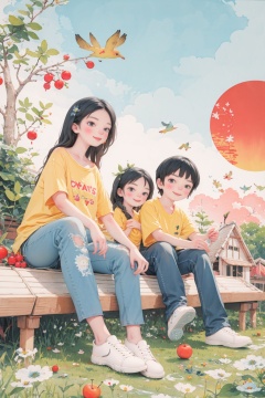 Two happy little boys and a little girl sat on the roof, taking full body photos and laughing happily. The boy is wearing a yellow short sports shirt and red sports shoes, while the girl is wearing a white sports shirt, jeans, white sports shoes, black hair, a house, flowers, and small animals. A happy little boy with a round face, big eyes, long eyelashes, sunset andsunset,, A ink painting of a tranquil orchard with Chinese writing on it and a pair of birds building their nest, with a fruit-laden branch in the foreground, An Zhengwen, organic painting, a minimalist painting, art & language, ink and wash,