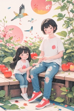 Two happy little boys and a little girl sat on the roof, taking full body photos and laughing happily. The boy is wearing a yellow short sports shirt and red sports shoes, while the girl is wearing a white sports shirt, jeans, white sports shoes, black hair, a house, flowers, and small animals. A happy little boy with a round face, big eyes, long eyelashes, sunset andsunset,, A ink painting of a tranquil orchard with Chinese writing on it and a pair of birds building their nest, with a fruit-laden branch in the foreground, An Zhengwen, organic painting, a minimalist painting, art & language, ink and wash,