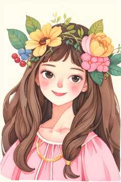 The watercolor painting features a young girl with long, flowing brown hair, wearing a pink dress with an apple pattern. She is wearing a flower crown and looking directly at the viewer with a gentle expression. The colors in the painting are vibrant and bright, with shades of pink, red, and yellow. The background is a mix of blue and yellow, creating a cheerful and lively atmosphere. The girl's expression and the flower crown give off a sense of joy and playfulness.