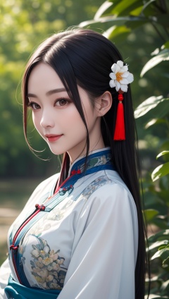 (best quality:1.4),(masterpiece:1.4),(8K:1.4),(extremely detailed:1.4),(Beautiful and detailed face:1.2),(close up:1.2),1girl,solo,looking at viewer,arms at sides,smile,(Extremely detailed chinese clothes:1.2),hanfu,architecture,east asian,riverside,forest,