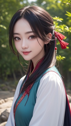 (best quality:1.4),(masterpiece:1.4),(8K:1.4),(extremely detailed:1.4),(Beautiful and detailed face:1.2),(close up:1.2),1girl,solo,looking at viewer,arms at sides,smile,(Extremely detailed chinese clothes:1.2),hanfu,architecture,east asian,riverside,forest,