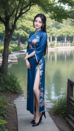 (best quality:1.4),(masterpiece:1.4),(8K:1.4),(extremely detailed:1.4),(Beautiful and detailed face:1.2),(full body:1.2),1girl,solo,looking at viewer,arms at sides,smile,(Extremely detailed chinese clothes:1.2),hanfu,architecture,east asian,riverside,forest,