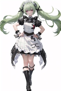 8k, best quality, masterpiece, (ultra-detailed:1.1), (high detailed skin), (full body:1.3), white background, standing, hand on hip, looking at viewer, <lora:corin-v100-000028:0.8:lbw=OUTALL>, corin, 1girl, twintails, boots, apron, long hair, maid headdress, green hair, (white background, simple background,:1.2), (beautiful_face), ((intricate_detail)), clear face, ((finely_detailed)), fine_fabric_emphasis, ((glossy)), full_shot,