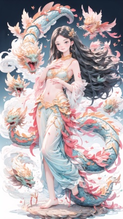 Masterpiece, best quality, 1 girl, pink eyes, (big chest), optional costume, (fine close-fitting armor), fringe, looking at the audience, blush, bag, symbolic pupil, (black long hair fluffy), bangs, a beautiful dragon standing on the dragon body behind him, delicate beautiful dragon), (bare white belly, (outdoor), (Wide heaven and earth), (barefoot on the scale of the dragon), (dragon flying in the sky), (love tattoo on the thigh), (barefoot, delicate barefoot), (white instep exposed), (barefoot, delicate barefoot), 1girl, dunhuang