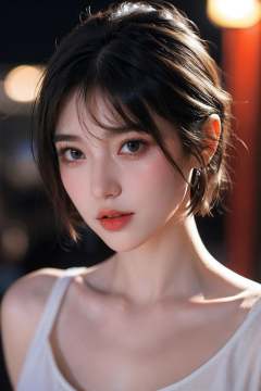 1girl,solo,short hair,realistic,lips,parted lips,half body,night,blurry background,