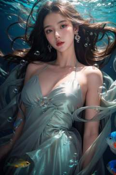 1girl,solo,hair ornament,dress,earrings,jewelry,fish,looking at viewer,underwater,upper body,bubble,water,sfw,
