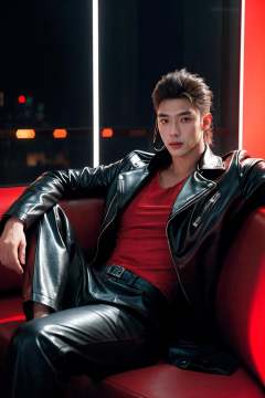 a very handsome young male gangster in a leather jacket of bold futuristic design. he is sitting on a plush sofa with his legs crossed,drinking,looking at us,the smoke contrasting beautifully with the red light of the room. The location is a futuristic high-rise hotel,and the glass wall behind him reveals a futuristic metropolis. He is the young gang of the city of the future,full of confidence and spaciousness. This high quality,artistic digital art is mesmerizing to look at and is super detailed. Super-detailed face,super-detailed skin,super-detailed eyes.,pants,
