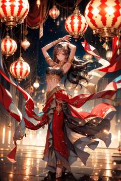 (masterpiece:1.2),best quality,PIXIV,dance dive, 1girl, solo, long hair, jewelry, looking at viewer, bracelet, arms up, skirt, navel, black hair, armlet, earrings, midriff, dancer, gem, lantern, blurry, necklace, red skirt, long skirt, head chain, dancing, breasts, standing, closed mouth, bare shoulders, lamp, armpits, light particles, bangs<lora:dancing diva:1>,