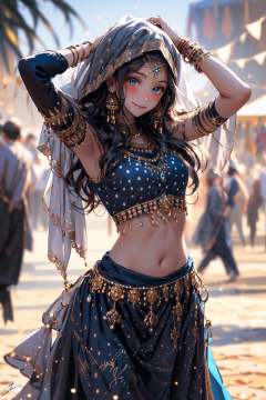 -dance dive, 1girl, jewelry, navel, bracelet, long hair, blue eyes, midriff, blush, skirt, blurry, armlet, black hair, veil, crop top, looking at viewer, solo focus, smile, arabian clothes, blurry background, signature, breasts, arms up, closed mouth, necklace, dancer, depth of field, see-through, earrings, cowboy shot, bangs, stomach, gold, polka dot, gold trim, black skirt, shirt<lora:dancing diva:1>,