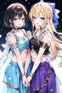-dance dive, multiple girls, 2girls, blonde hair, jewelry, smile, holding hands, earrings, navel, blue eyes, skirt, bracelet, black hair, short hair, midriff, :d, long hair, open mouth, collarbone, hair ornament, bangs, bare shoulders, red bow, armlet, closed mouth, looking at another, purple eyes, blush, blue skirt, shirt, yuri, short sleeves, brown eyes<lora:dancing diva-000018:0.8>,