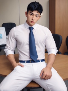 masterpiece,1 Man,Look at me,Short hair,Handsome,Beard,shirt,Tie,white pants,salaryman,Office,Indoor,Sit down,Coffee,textured skin,super detail,best quality,,