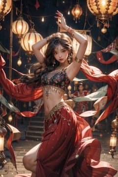 (masterpiece:1.2),best quality,realistic,photorealistic,dance dive, 1girl, solo, long hair, jewelry, looking at viewer, bracelet, arms up, skirt, navel, black hair, armlet, earrings, midriff, dancer, gem, lantern, blurry, necklace, red skirt, long skirt, head chain, dancing, breasts, standing, closed mouth, bare shoulders, lamp, armpits, light particles, bangs<lora:dancing diva-000018:0.8>,