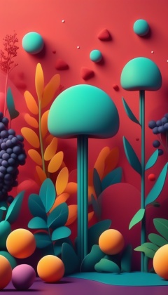 Amazing another planet plants and berries wallpaper, vibrant colors, simple, 3d soft gum shapes, harmony, sunny mood, ((minimalistic)), abstract, high quality, vector, clarity, subsurface scattering, volete sky