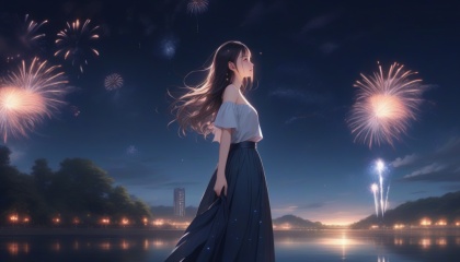 ((extremely detailed CG unity 8k wallpaper)),(masterpiece), (best quality), (ultra-detailed), (best illustration),(best shadow), (an extremely delicate and beautiful), ((((1girl)))), dynamic angle, floating, finely detail, (bloom), (shine), glinting stars, ((((best detailed fireworks)))), ((((depth of field)))), (((hanabi))), Beautiful detailed girl, (((backlight))), extremely delicate and beautiful girls, ((summer long skirt)), (((solo))), best detailed hair, ((beautiful detailed water)), night sky, (((small breast))), beautiful detailed sky, beautiful detailed eyes, (((arms behind back))), long hair, (((dynamic angle))), long skirt