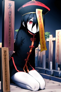 1girl,wsjs,jiangshi,chinese zombie,empty eyes,spell,jiangshi costume,look at different places with both eyes,in the cemetery,pale skin,the whole body,