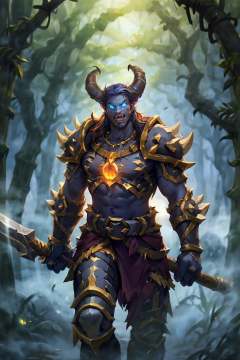 HEZI, Hearthstone, armor, glowing, 1boy, solo, male focus, glowing eyes, horns, weapon, nature, teeth, forest, monster, yellow eyes, spikes, helmet, tusks, outdoors, holding, colored skin, tree, looking at viewer, gauntlets, no humans, sharp teeth, blue skin, orange eyes, standing, watermark, hammer, artist name, breastplate, bamboo, axe, holding weapon, fangs, bamboo forest<lora:炉石传说-000006:0.7>,