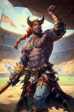 HEZI, Hearthstone, male focus, 1boy, weapon, tusks, necklace, solo, facial hair, holding, jewelry, holding weapon, beard, muscular male, teeth, standing, muscular, orange hair, long hair, braid, fangs, colored skin, pectorals, loincloth, ponytail, abs, tribal, outdoors, furry male, stadium, blurry background, polearm, horns, feet out of frame, smile, blue skin, furry, bracer, animal ears, tooth necklace, sharp teeth, topless male, bara, day, blurry, hair tie, armor, arm up, clenched hand, fangs out,<lora:炉石传说-000006:0.7>,