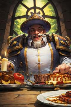 HEZI, Hearthstone, candle, male focus, 1boy, food, bread, facial hair, beard, knife, solo, muscular male, armor, indoors, muscular, bottle, old, window, pectorals, upper body, white hair, apple, fruit, plate, shirt, old man, smile, bara, white shirt, fat, open mouth, looking at viewer, table, partially unbuttoned, wrinkled skin, mustache, shoulder armor, pig, candlestand, large pectorals, mature male, fat man, button gap, tongue, fire, fork, buttons, braid, steak, pauldrons, meat, dark skin, onion, cheese,<lora:炉石传说-000006:0.7>,