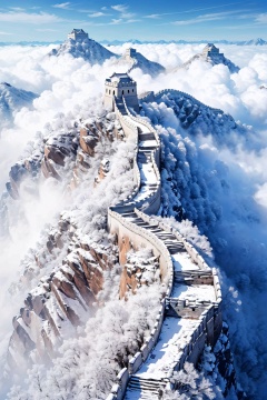 Best quality,8k,cg,arafed view of a snow covered wall with a person walking on it, great wall, the great wall, castle made of clouds, sha **, amazing wallpaper, beautiful wallpaper, castle in the clouds, high quality wallpaper, flying cloud castle, winter, a dragon made of clouds, january, by Cheng Jiasui, high-quality wallpaper, ancient chinese architecture