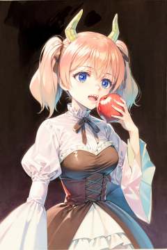 masterpiece, best quality, <lora:style19:1>,watercolor \(medium\), traditional media, <lora:ri-nie:1>,1girl, solo, horns, food, apple, fruit, twintails, large breasts, open mouth, corset, eating, breasts, dress, brown hair, teeth, holding fruit, ribbon, long sleeves, puffy sleeves, sharp teeth, simple background, blue background, juliet sleeves, holding, brown eyes