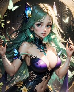 (masterpiece, best quality)),(detail face,perfect face),upper_body,bust,portrait,lol style,game cg,Dynamic angle,1girl,very_long_hair,green_hair,solo,fairy,glowing_butterfly,dancing,butterfly_hair_ornament,butterfly_wings,fairy_wings,animal,elbow_gloves,bird,(botanical garden:1.2),magic circles,(colourful glass),(complex background:1.1),bright,glowing,illuminatio,particle effects,Balance and coordination between all things,