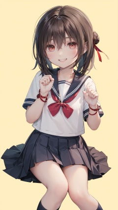 1girl, solo, brown hair, skirt, school uniform, smile, brown eyes, hair bun, single hair bun, short sleeves, red ribbon, simple background, socks, white sailor collar, shirt, ribbon, looking at viewer, pleated skirt, white socks, yellow background, white shirt, grin, serafuku, sailor collar, bangs, neck ribbon, blush, sitting, twitter username, kneehighs, black skirt, knee up, short hair, hair between eyes, hands up, blue skirt
